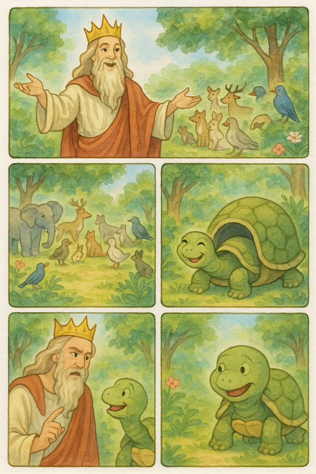 모든 동물들이 참석했지만, 거북이는 끝내 모습을 보이지 않았습니다.