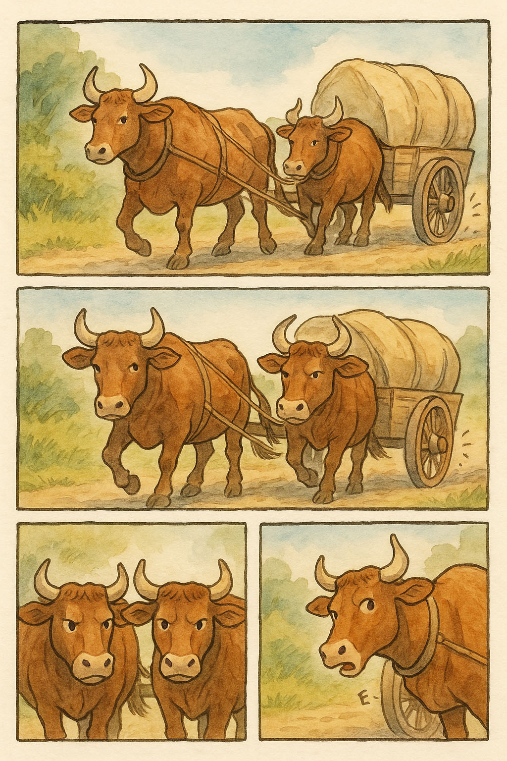 두 마리의 소가 무거운 짐이 실린 수레를 끌고 길을 가고 있었습니다.