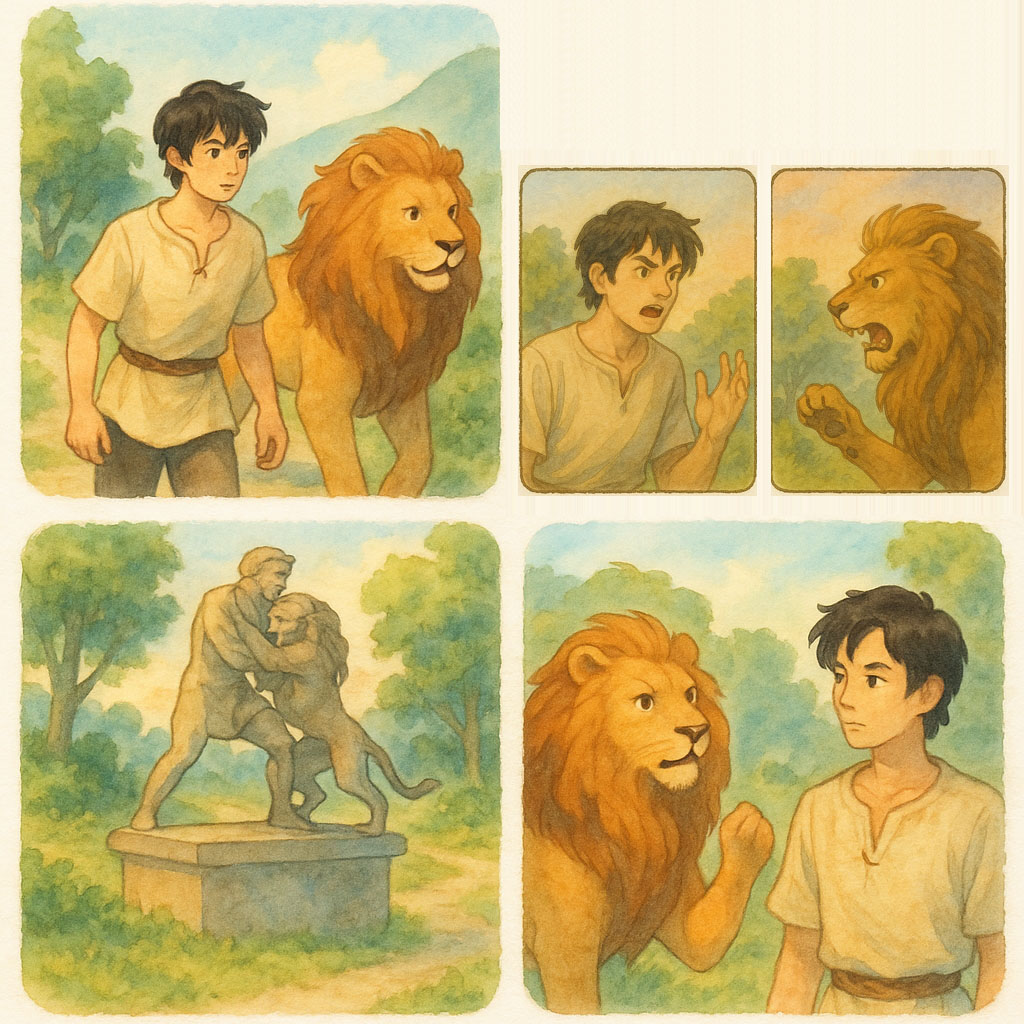 A Man and a Lion were companions on a journey, and in the course of conversation they began to boast about their prowess, and each claimed to be superior to the other in strength and courage.