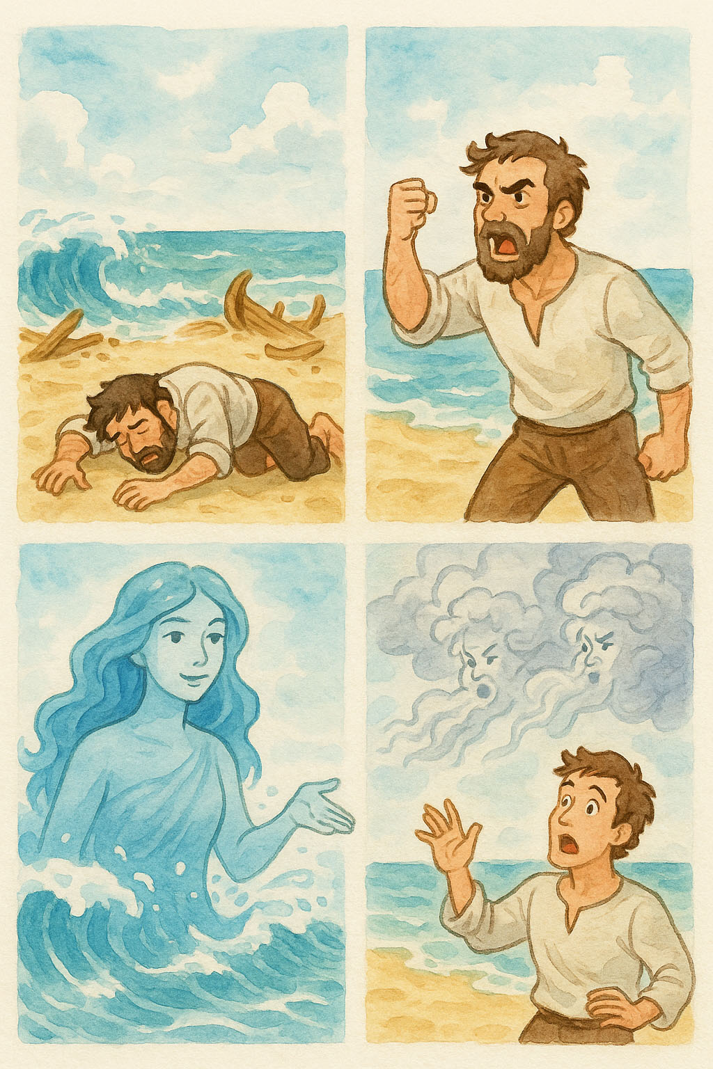 난파된 한 남자가 해변에 떠밀려와 파도와 싸운 끝에 잠에 들었다.