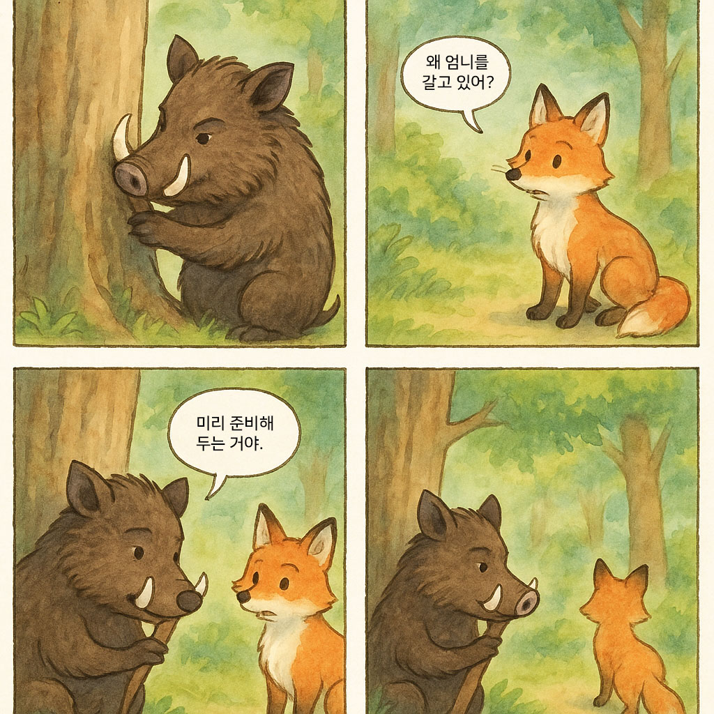 “무슨 일이야? 오늘은 사냥꾼도 없고, 위험도 없는데 왜 엄니를 갈고 있어?”