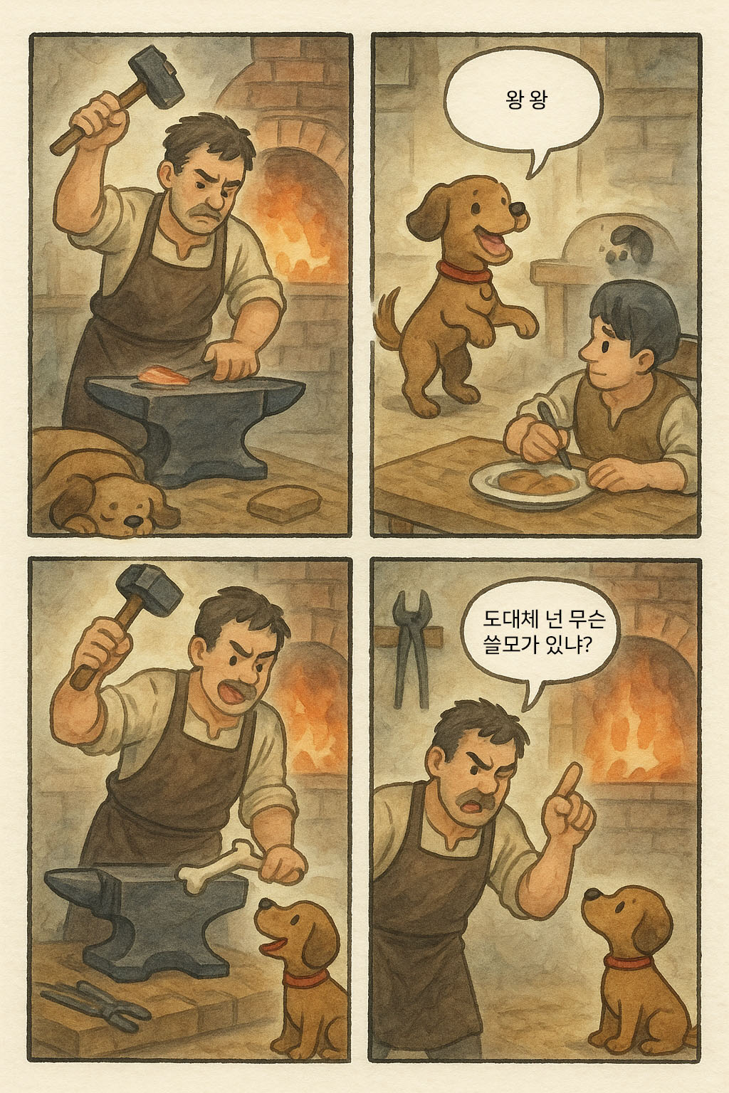 “도대체 넌 무슨 쓸모가 있냐? 내가 쇠망치를 두드릴 땐 늘 자빠져 자더니, 막상 내가 밥을 먹으려 하면 꼬리를 흔들며 다가와 먹을 생각뿐이군!”