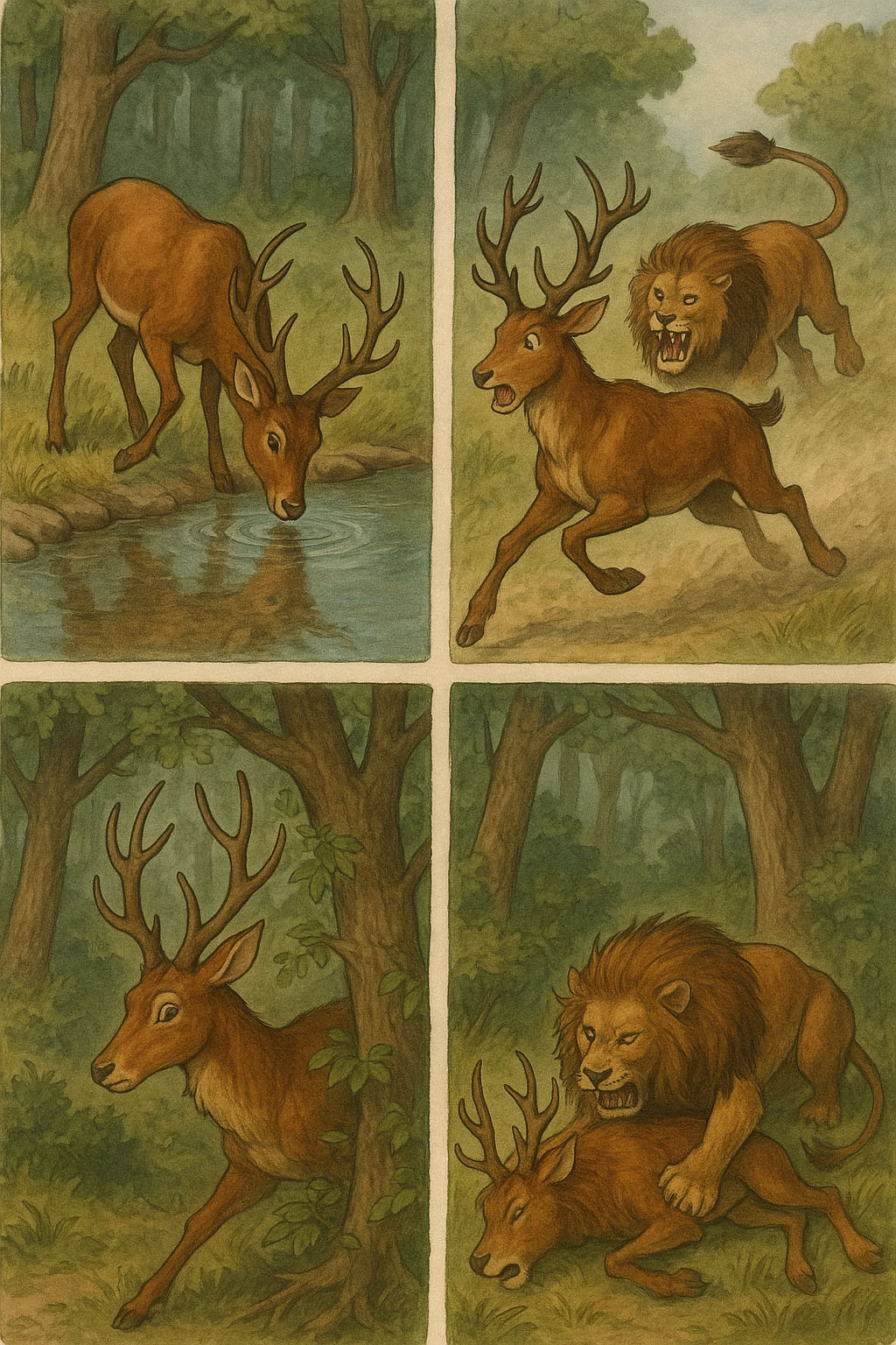 しかし森に入ると、角が枝に引っかかってしまい、ついにはライオンに捕まってしまいました。
