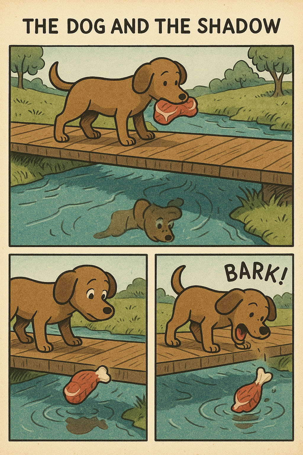 A Dog was crossing a plank bridge over a stream with a piece of meat in his mouth, when he happened to see his own reflection in the water.