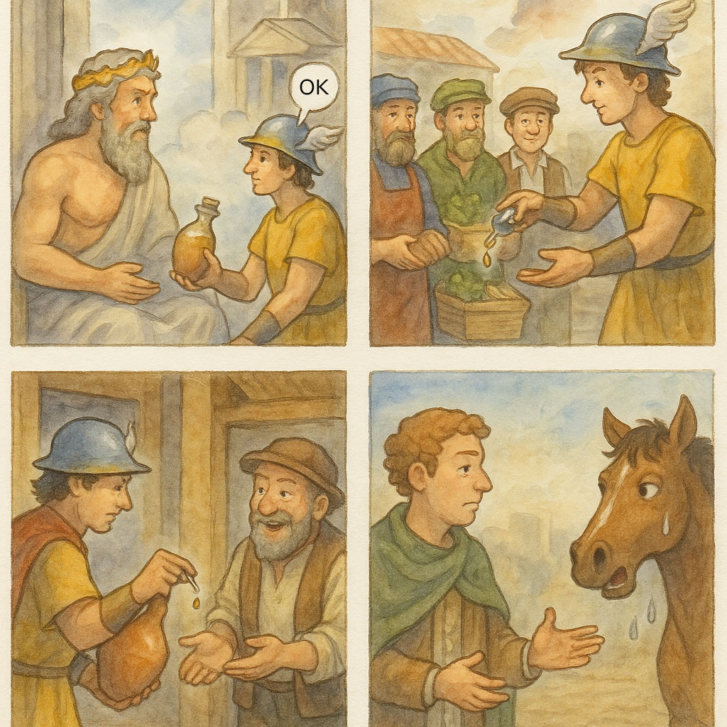 ところが最後の馬商人の番になったとき、エキスがまだ大量に余っていることに気づいたマーキュリーは、その残り全部を馬商人に注ぎ込みました。
