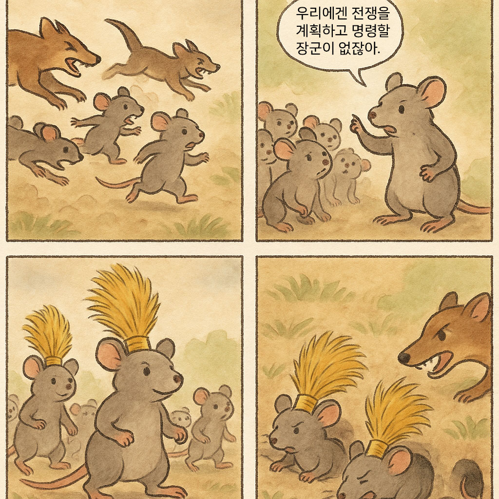 그의 말에 따라 가장 크고 튼튼한 쥐들을 장군으로 뽑고, 이들은 일반 병사와 구분되도록 볏짚으로 만든 깃털 장식을 머리에 달았습니다.