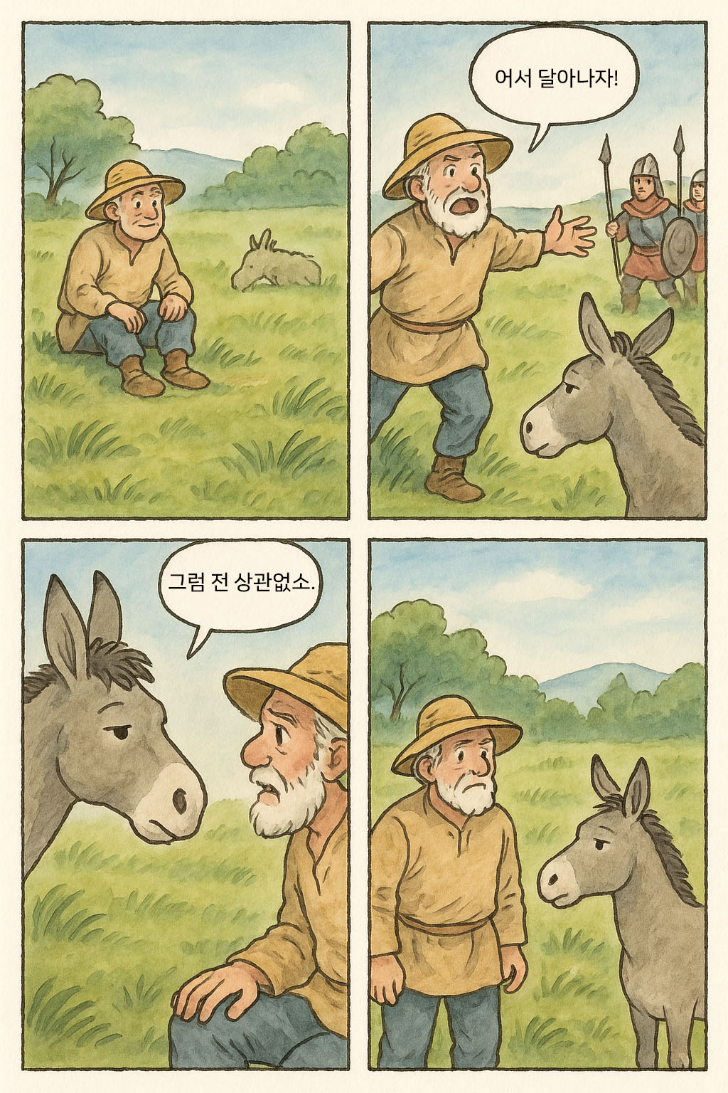 한 늙은 농부가 초원에 앉아, 근처에서 풀을 뜯는 자기 당나귀를 바라보고 있었습니다.