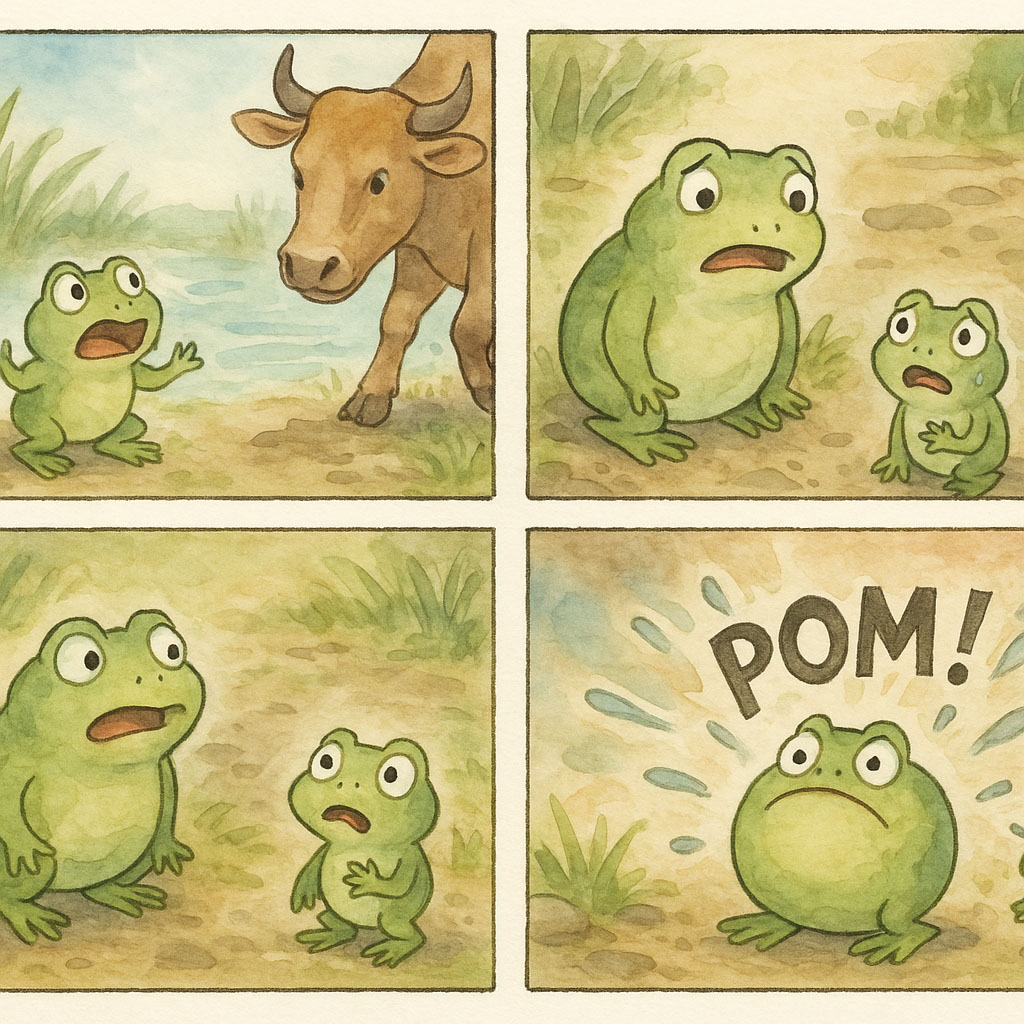 개구리는 계속 몸을 부풀리다가 결국 너무 팽창해서 펑! 하고 터지고 말았답니다.