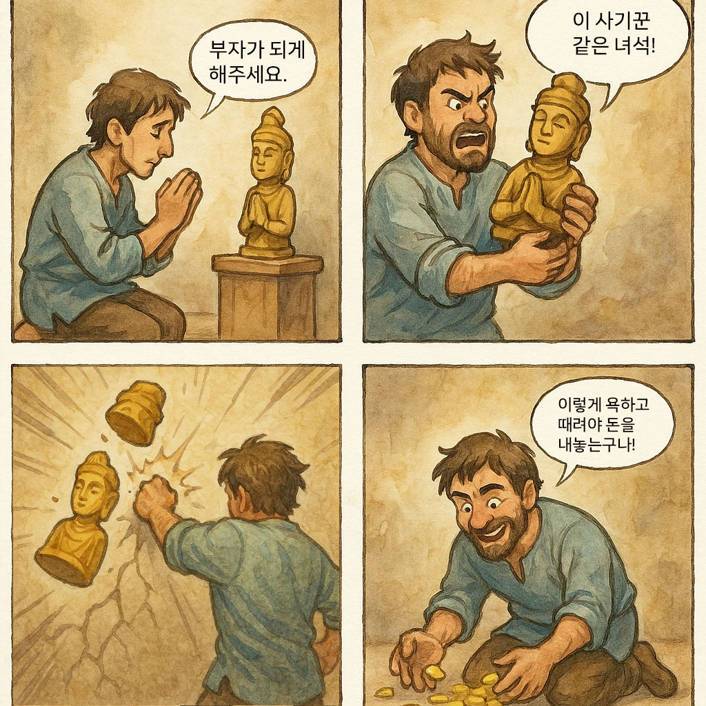 어느 가난한 사람이 나무로 만든 신상을 하나 가지고 있었는데, 매일 그것 앞에서 부자가 되게 해달라고 기도했습니다.