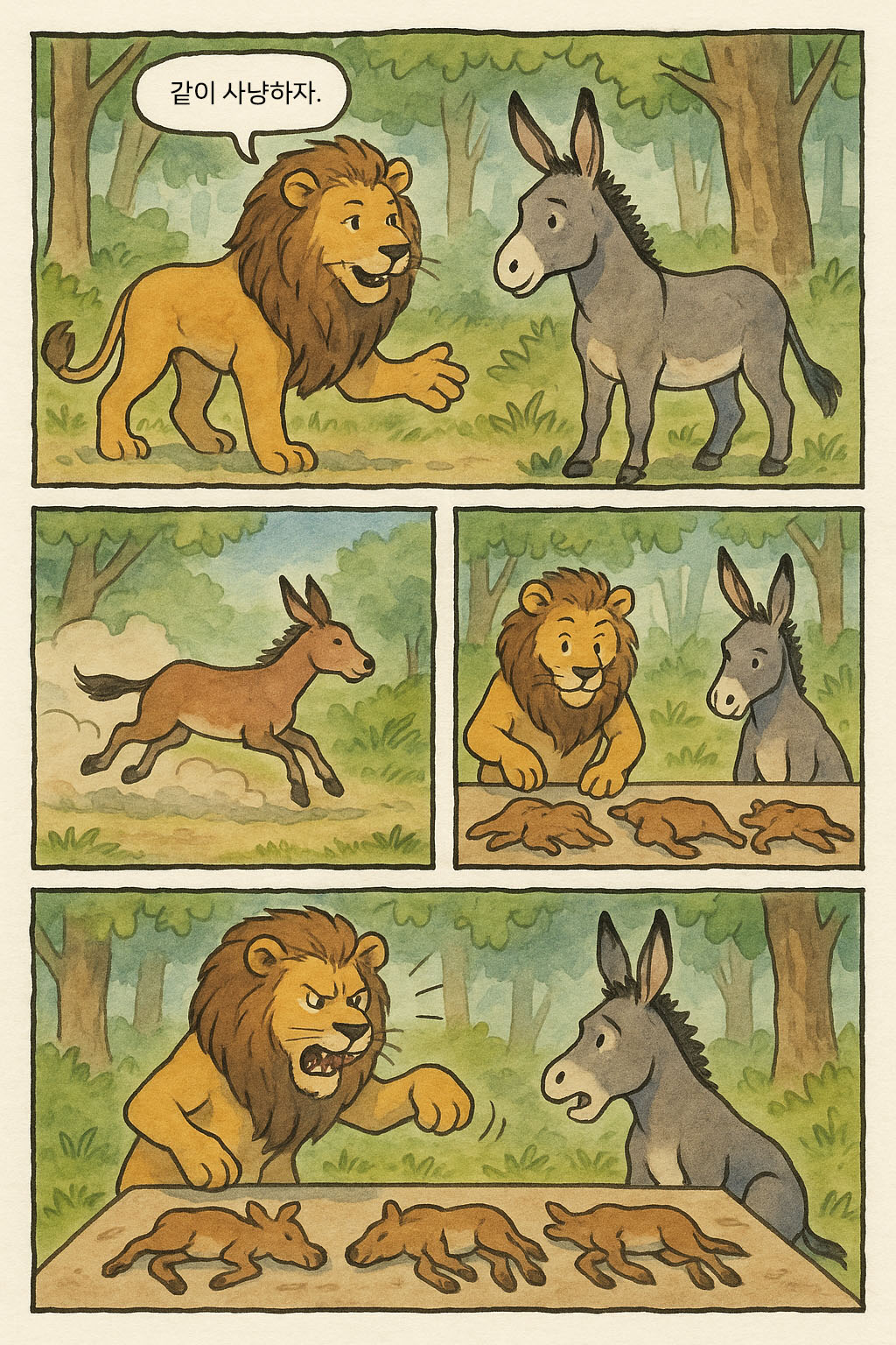 그런데 사자가 먹잇감을 나누는 순간, 그는 그것을 세 몫으로 나누더니 이렇게 말했습니다.