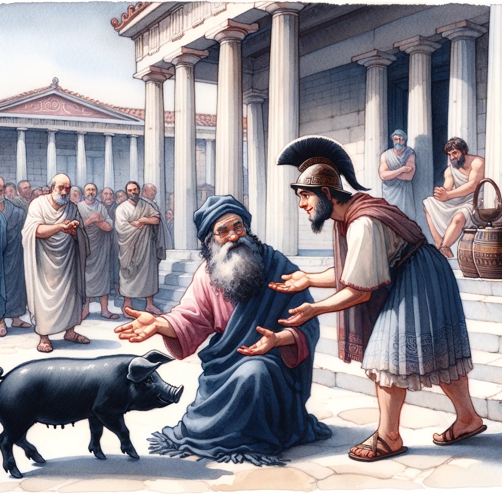 Not being able to persuade his creditor, he led a sow, the only one he owned, and offered it for sale in front of him.