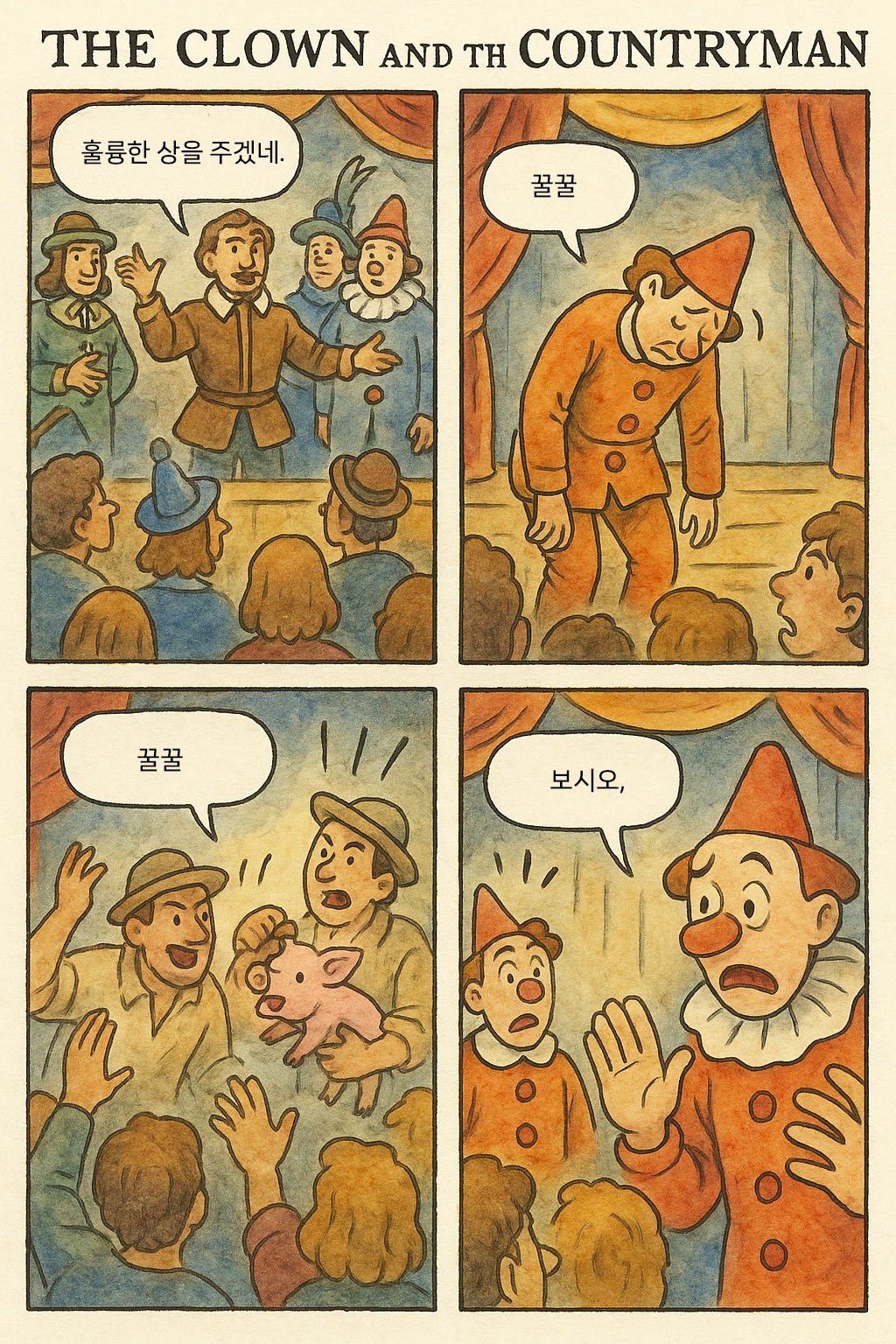 하지만 관객들은 한목소리로 광대의 흉내가 더 진짜 같다고 외쳤다.
