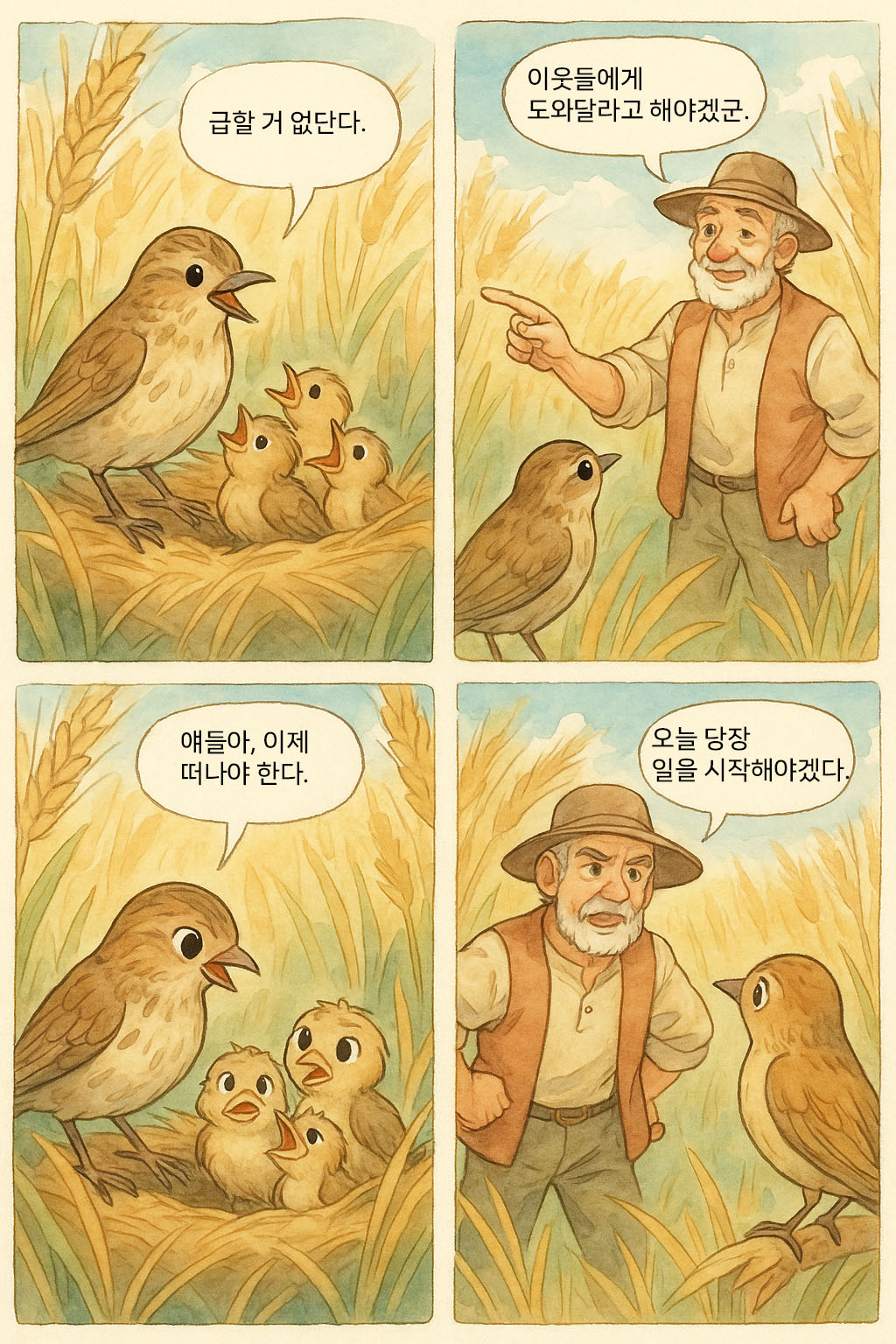 아직 새끼들이 완전히 날 수 없을 때, 농부가 밭을 둘러보러 와서 곡식이 누렇게 익어가는 것을 보고 말했다.