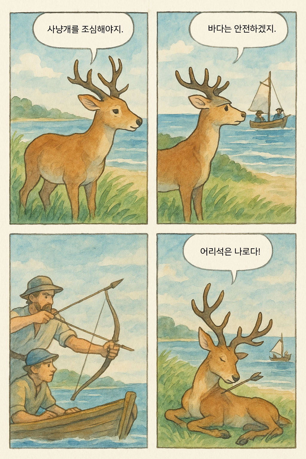 어느 사슴이 한쪽 눈이 멀어 바닷가에서 풀을 뜯고 있었다.