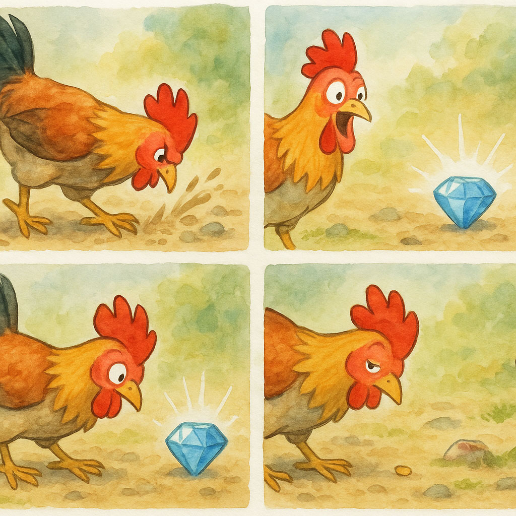 한 마리 수탉이 먹이를 찾으려고 땅을 발로 파다가 우연히 보석을 발견했다.
