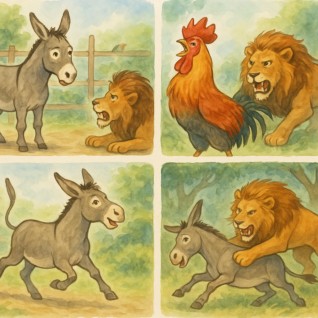 しかし、ニワトリの声が届かないところに来ると、ライオンは急に振り返り、ロバを食べてしまいました。