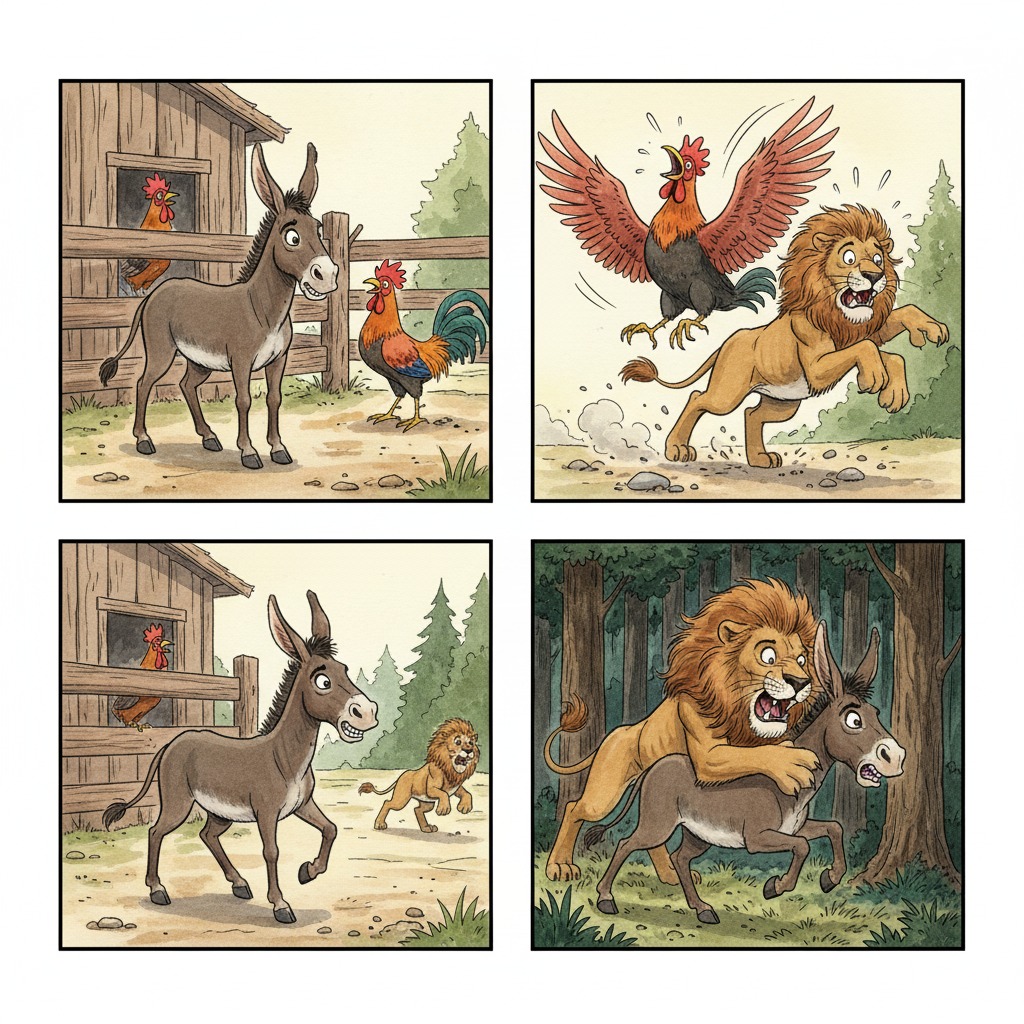 The Ass was mightily elated at this, and thought that, if the Lion couldn't face a Cock, he would be still less likely to stand up to an Ass: so he ran out and pursued him.