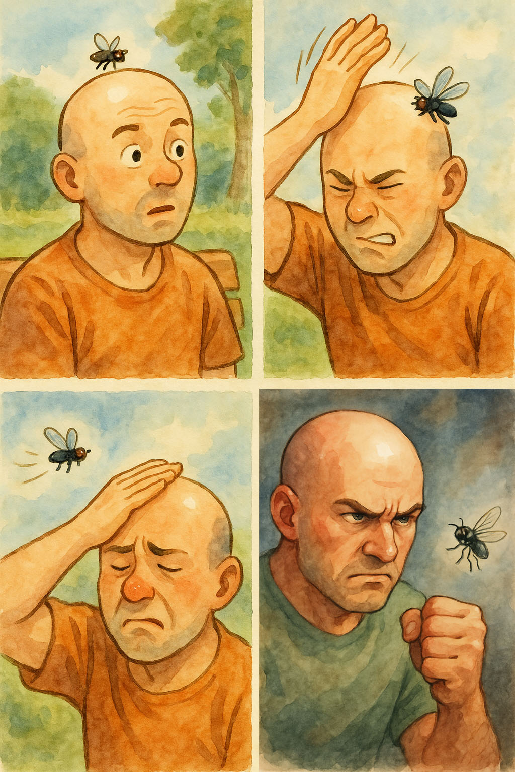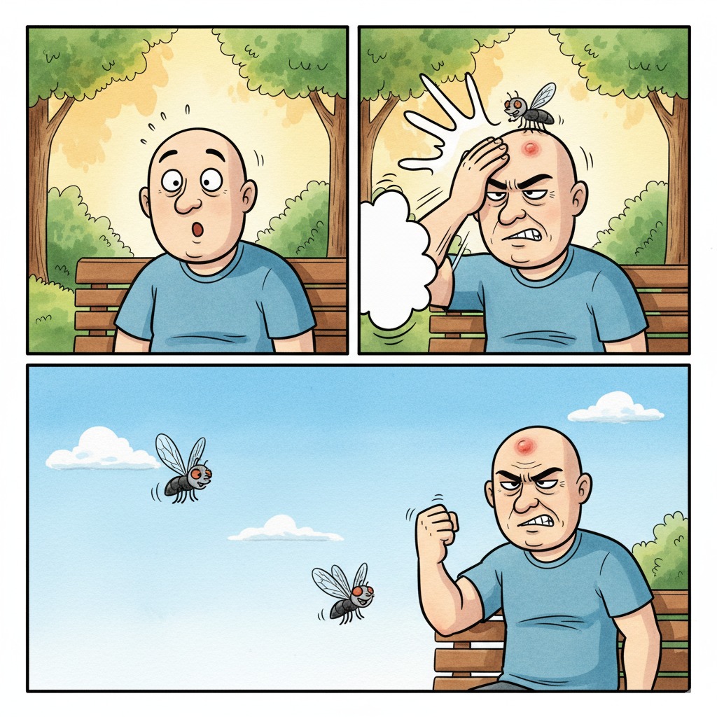 한 파리가 대머리 남자의 머리에 앉아 그를 물었습니다.