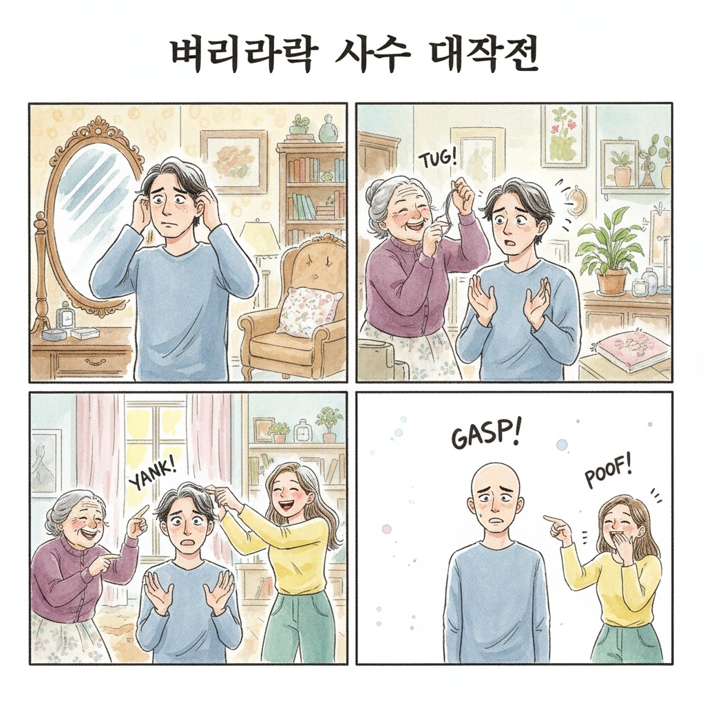 반대로 젊은 여자는 자신보다 늙어 보이는 게 싫어서 기회가 있을 때마다 그의 흰 머리카락을 뽑아내어 젊어 보이게 만들었다.