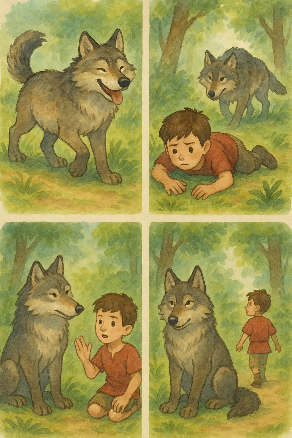 소년이 자신을 피해 두려움에 떠는 것을 눈치 챈 늑대는 다가가 말했습니다.