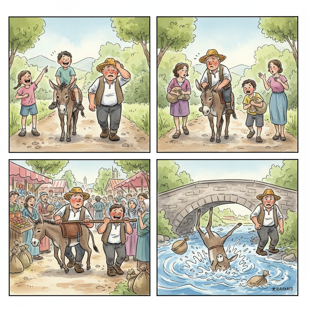 “모두를 만족시키려다 결국 아무도 만족시키지 못했고, 당나귀까지 잃었구나.”