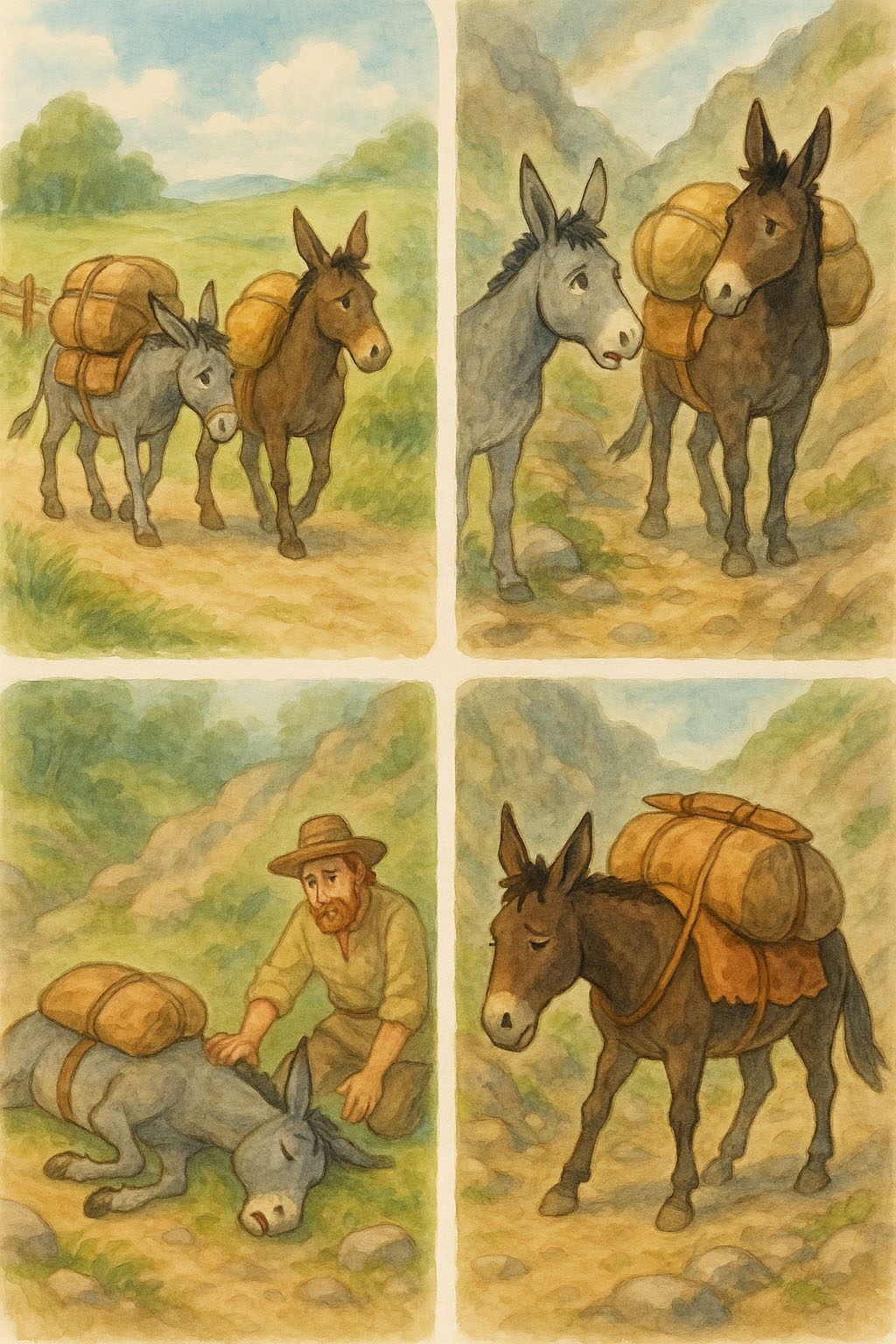 주인은 절망했지만 어쩔 수 없이 당나귀의 짐을 모두 노새에게 싣고, 심지어 당나귀의 가죽까지 벗겨 노새의 짐 위에 올렸다.