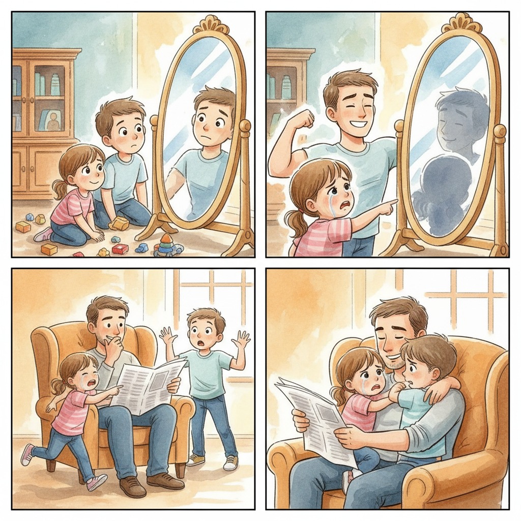 ある日、二人は母の部屋で遊んでいて、偶然鏡を見つけ、初めて自分たちの顔を映しました。