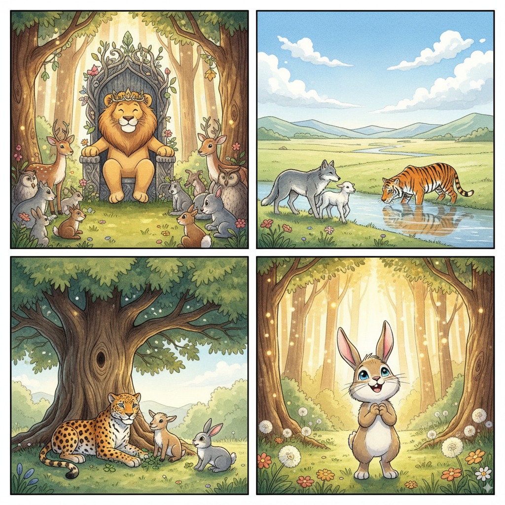 昔、ライオンが万物の王として君臨していた時、彼は決して残酷でも暴君的でもなく、王としてふさわしく温和で公正であった。