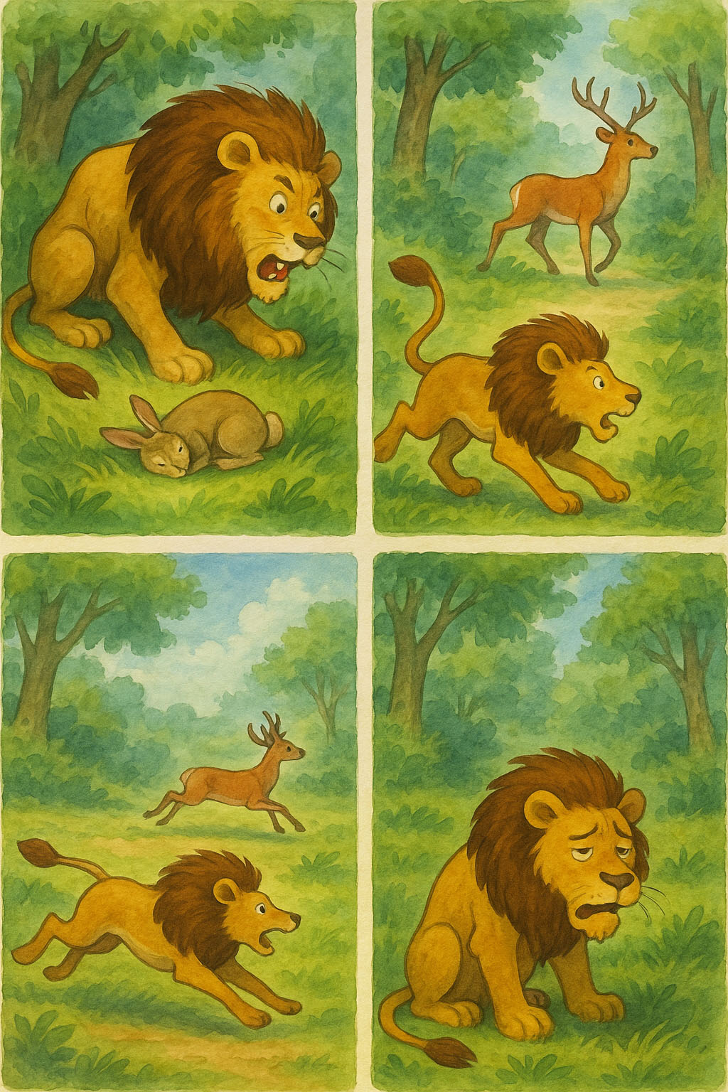 사자가 풀숲에 잠든 토끼를 발견하고 막 잡아먹으려는 순간, 길을 지나가는 사슴을 보게 되었다.