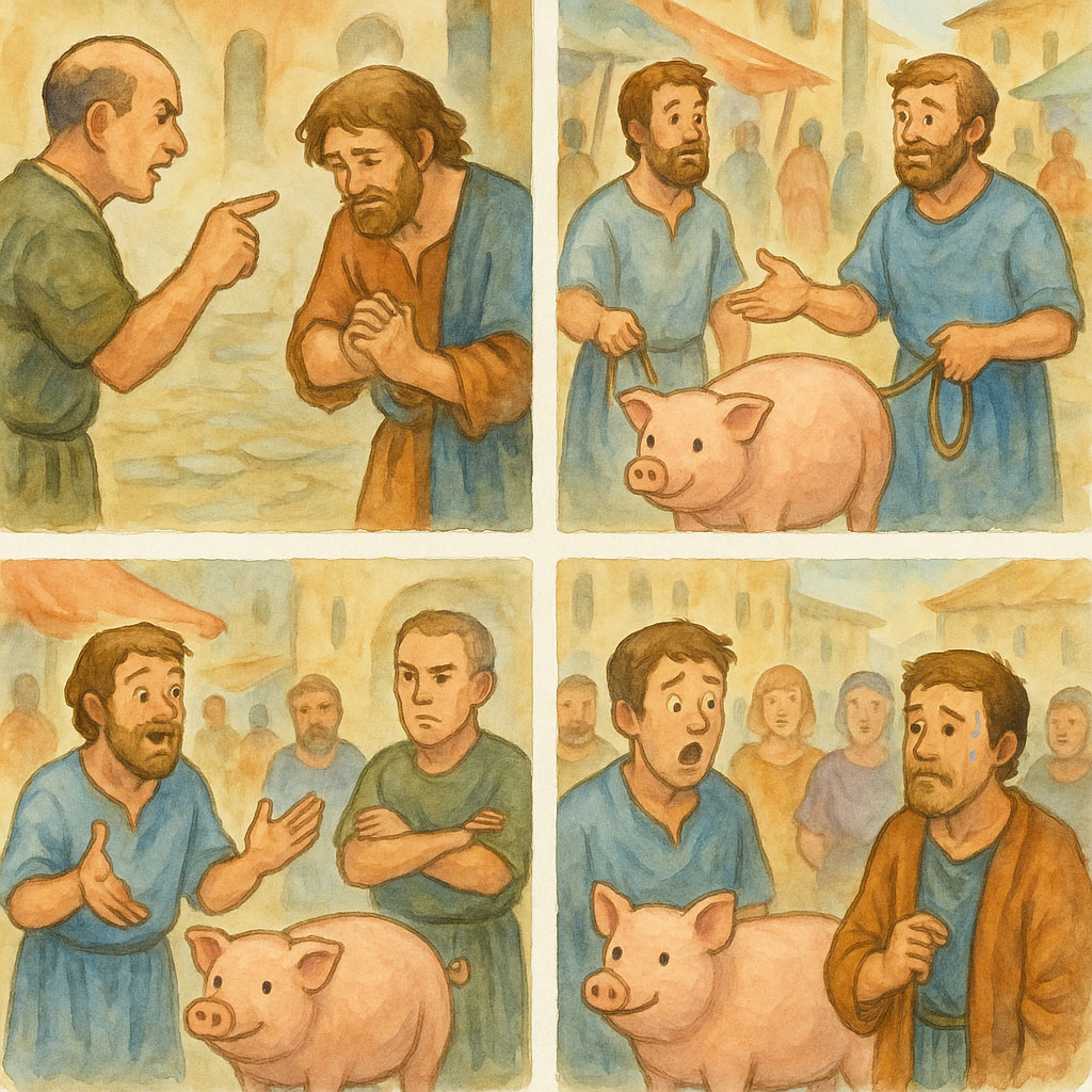 そこで彼は家にいるたった一頭のメス豚を市場に持って行き、売ろうとしました。