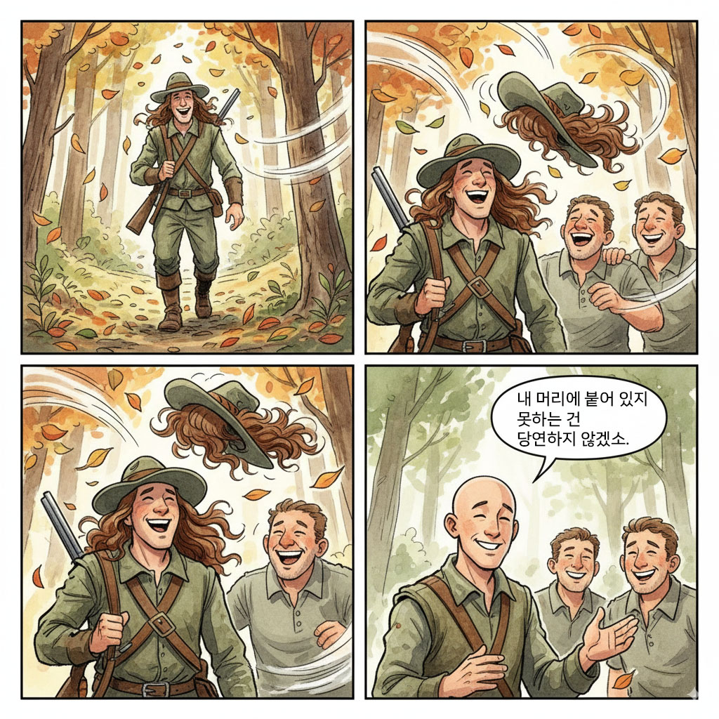 그런데 바람이 세차게 불던 날, 모자가 날아가 버리더니 가발까지 함께 벗겨지고 말았습니다.