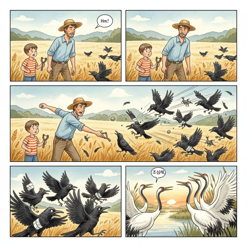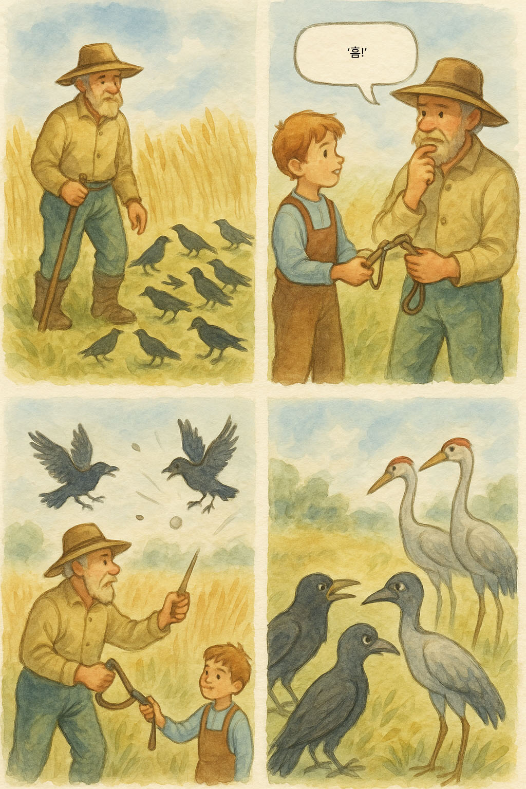 까마귀와 찌르레기들이 자꾸 날아와 곡식을 쪼아먹었기 때문이다.