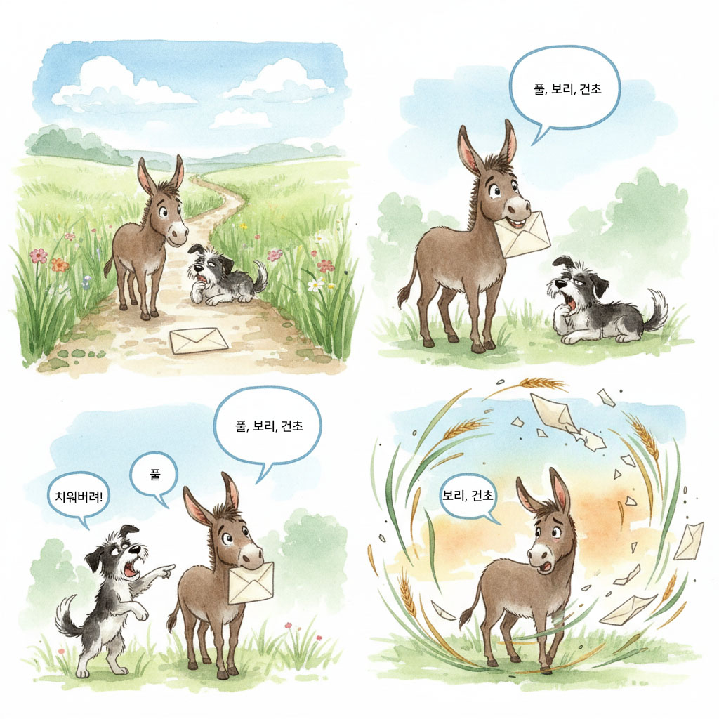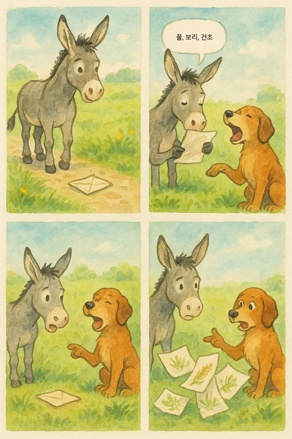 그런데 글의 내용은 온통 풀, 보리, 건초 등, 당나귀가 좋아하는 먹이에 관한 것뿐이었습니다.