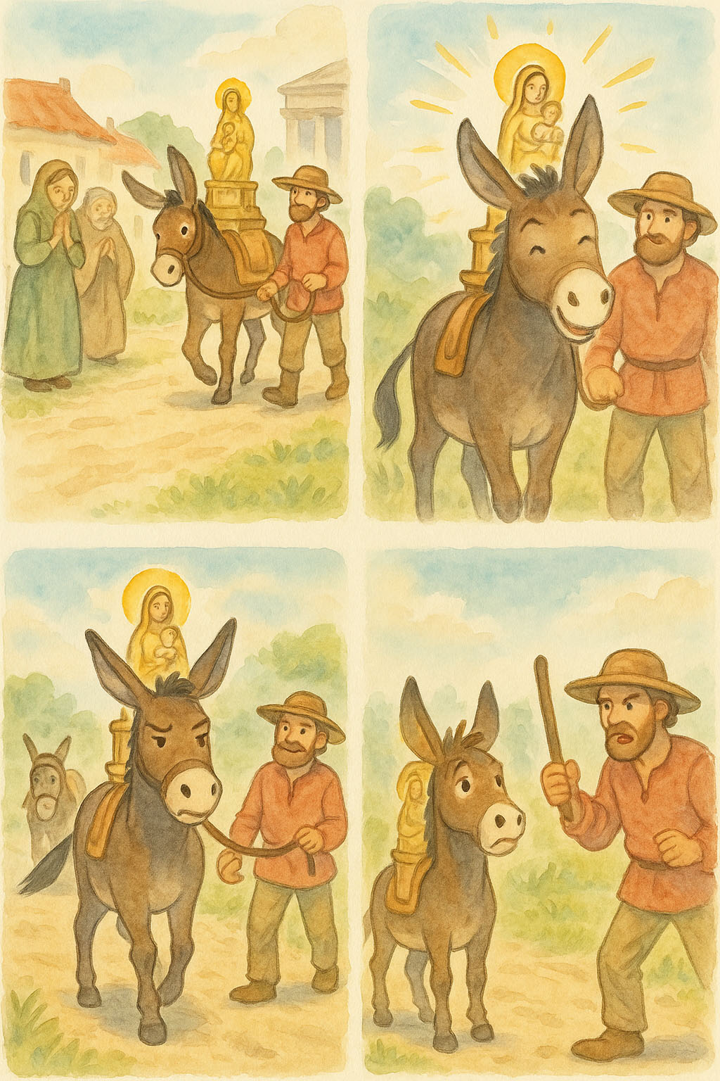 ある男がロバの背中に聖像を載せ、町の神殿へ運んでいました。