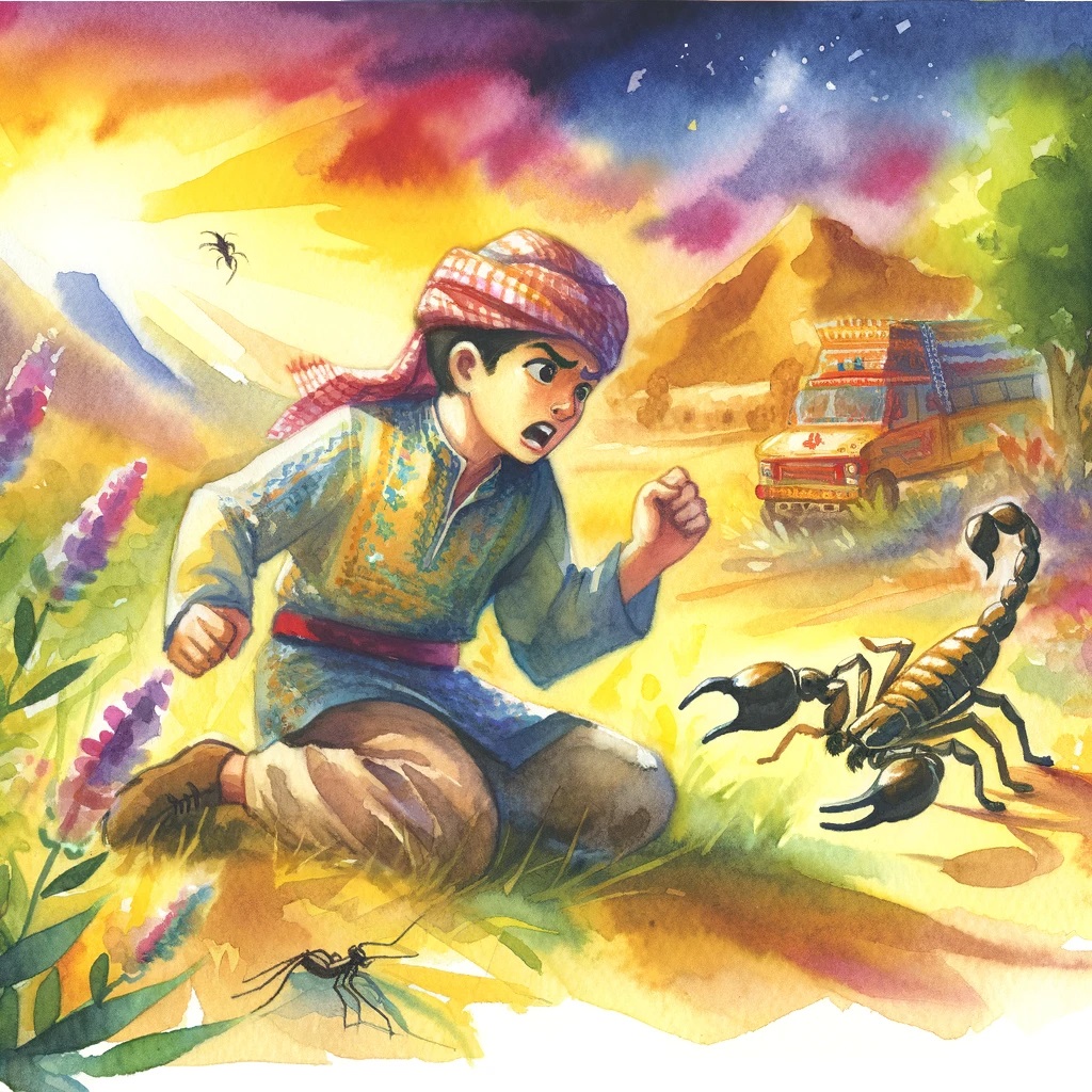 그러다 전갈 한 마리를 발견했는데, 소년은 그메뚜기라 착각하고서 손을 내뻗어 쥐고 말았어요.