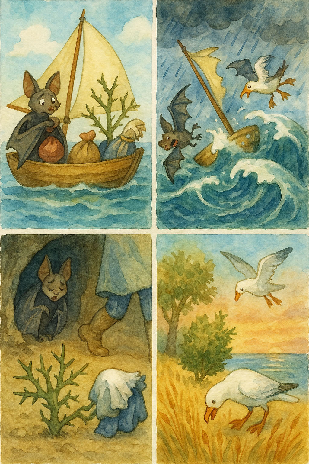 박쥐는 장사 밑천을 빌렸고, 가시덤불은 여러 종류의 옷을 챙겼으며, 갈매기는 납을 실어 출발했다.