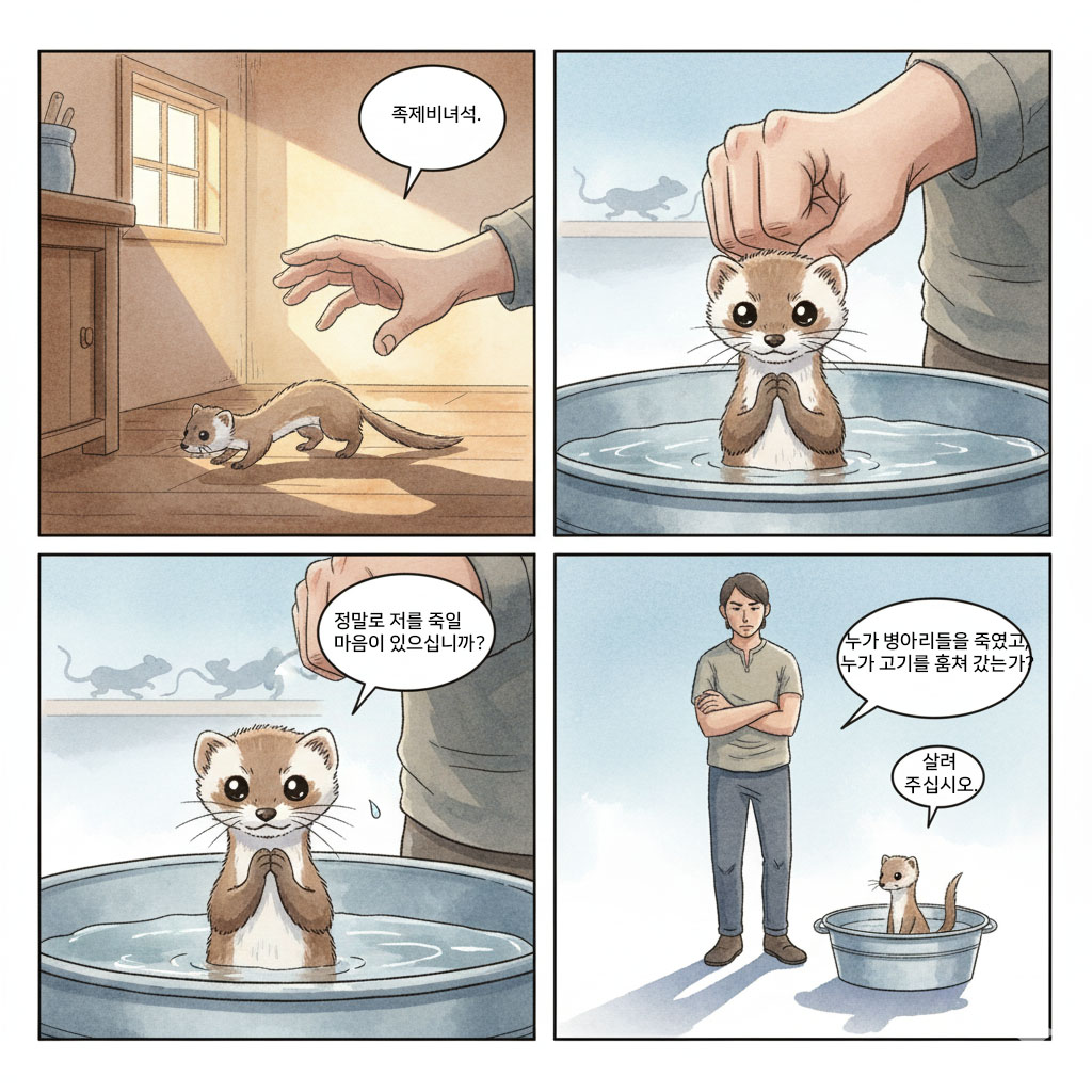 쥐와 도마뱀을 잡아 당신 집을 깨끗하게 해 드린 것을 생각하시고 제 목숨을 살려 주십시오.”