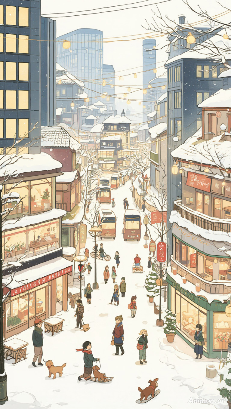 A cozy and bustling Nordic winter city scene illustrated in a whimsical, hand-drawn, minimalistic style. The streets are busy with cars, buses, cyclists, and people walking dogs. Tall modern buildings mix with charming cafés, bakeries, and flower shops on the ground level, all glowing warmly from their windows. Strings of soft yellow holiday lights crisscross the streets and hang between buildings, adding a magical touch. Snow gently falls on the sidewalks, which are filled with people chatting while holding coffee cups, friends laughing under heaters at café terraces, and kids pulling sleds past decorated shopfronts. Urban layout is detailed, with layered street levels, alleyways, balconies, and rooftop details. Some people carry shopping bags, some walk under umbrellas, and others pause under lantern-lit signs. The overall mood is warm, festive, and full of life--like a winter city in motion. Clean white background, bright accents of red, green, and gold, simple cartoon figures, Scandinavian charm. --p o8mkx9c