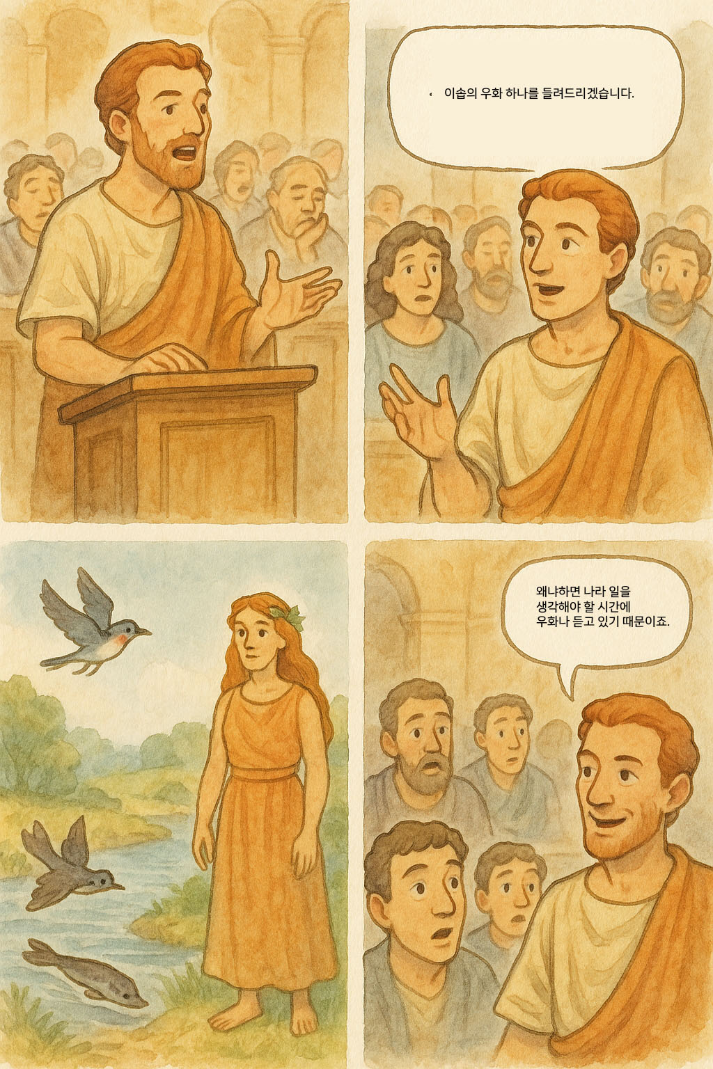 “여러분, 제가 이솝의 우화 하나를 들려드리겠습니다.”