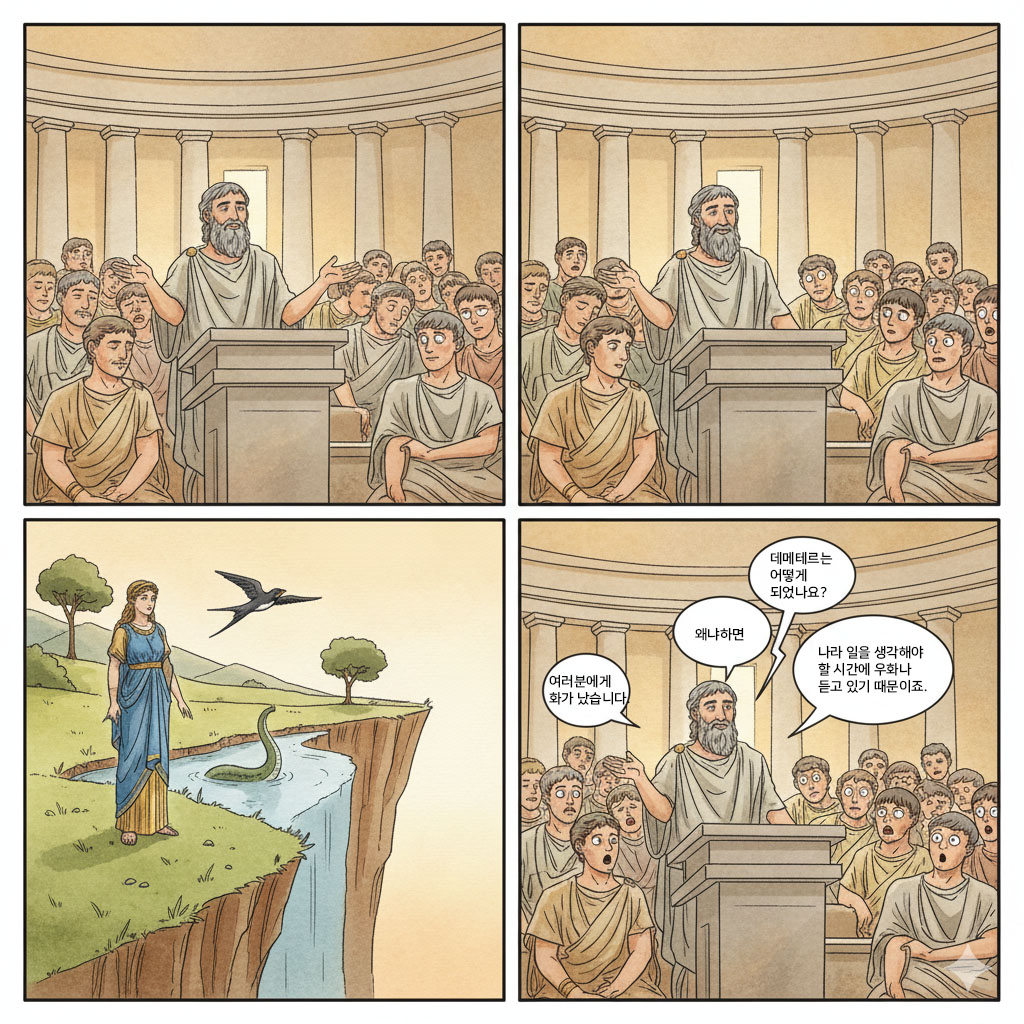 “데메테르, 제비, 그리고 장어가 함께 여행을 하다가 다리가 없는 강에 이르렀습니다.