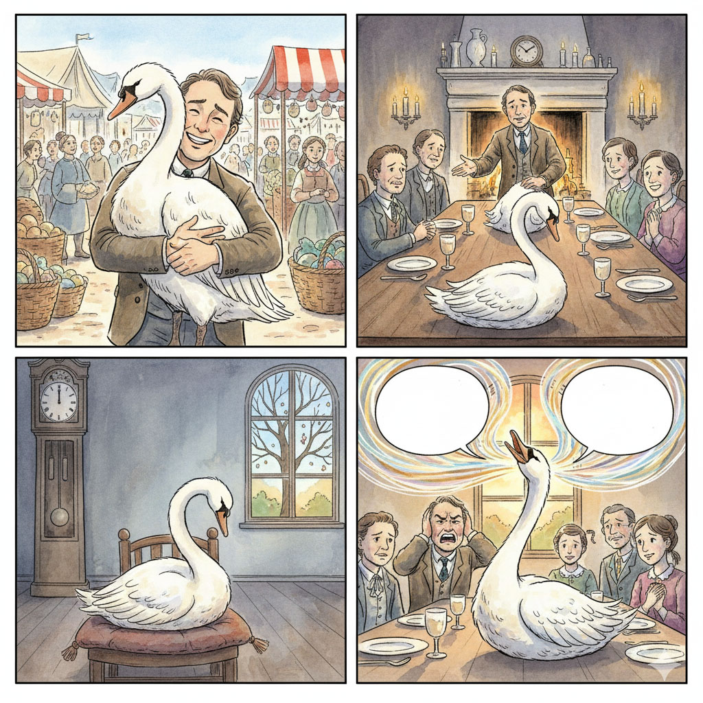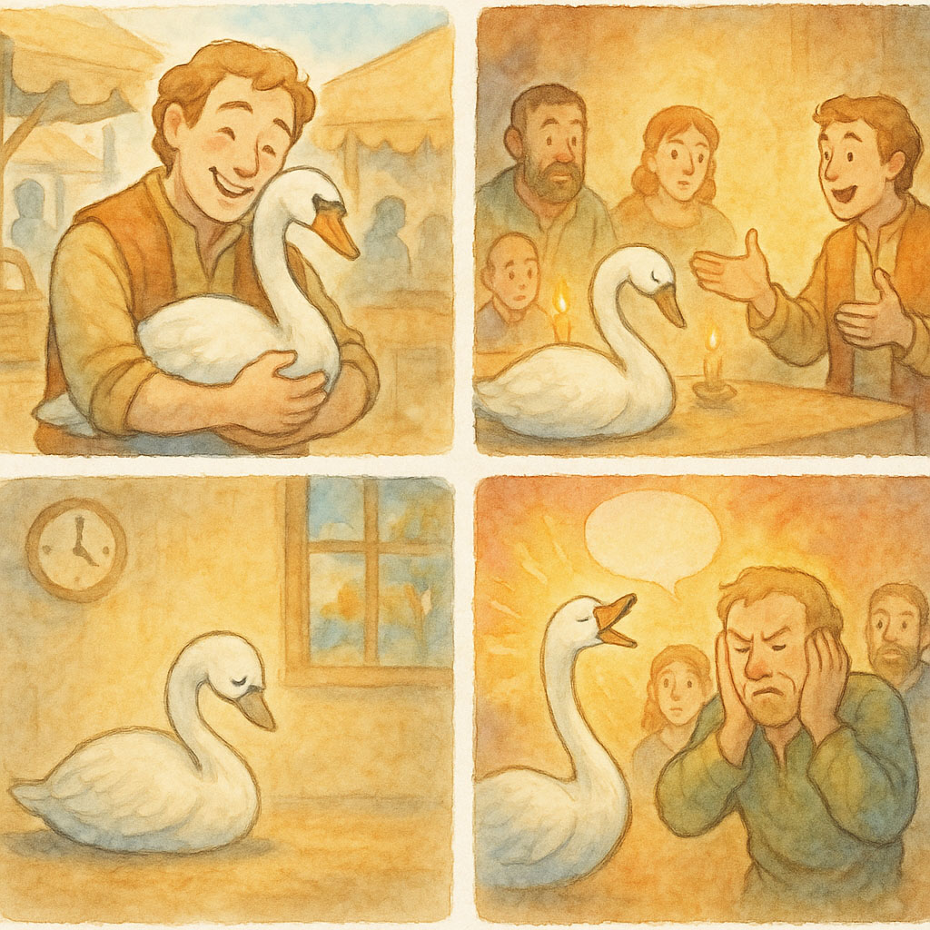 어느 날 한 남자가 백조의 노래 이야기를 듣고 시장에서 한 마리의 백조를 사서 집으로 데려갔다.