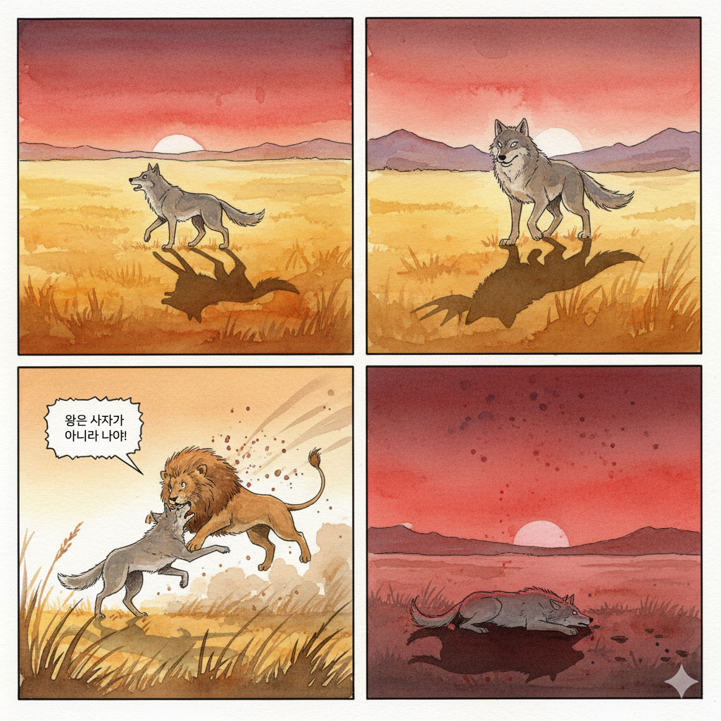 해가 지기 시작할 무렵, 평원을 돌아다니던 한 늑대는 자기 그림자의 크기에 크게 감탄했다.