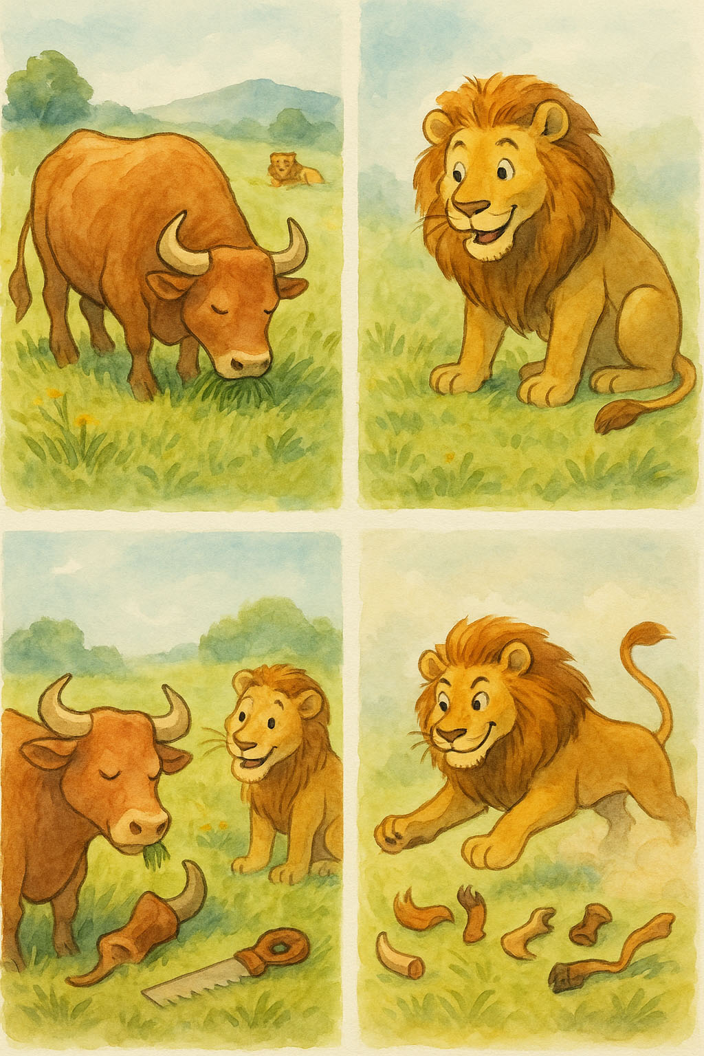 그 말을 곧이곧대로 믿은 어리석은 황소는 뿔을 잘라버렸고, 결국 방어 수단을 잃은 그는 사자의 쉬운 먹잇감이 되고 말았다.