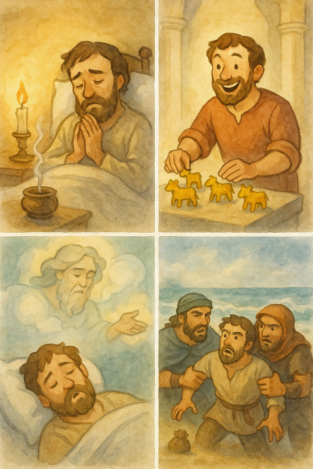 彼は喜び勇んで海岸へ行ったが、盗賊たちに捕まり、奴隷として売られた。