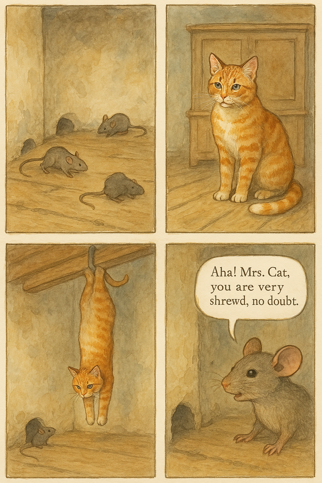 “아하! 고양이 아줌마, 당신은 틀림없이 매우 영리하시군요. 하지만 원하시면 그곳에 매달린 채 밥주머니로 둔갑하셔도 좋습니다. 그렇다 해도 아주머니 가까이에 가서 잡히는 생쥐는 없을겁니다.”