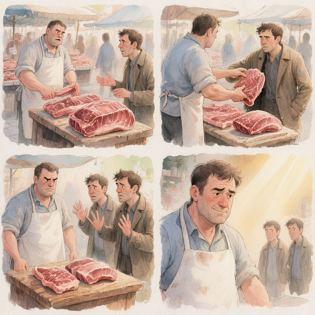 시장 한가운데 있는 도살업자의 가게에 두 남자가 고기를 사러 왔습니다.