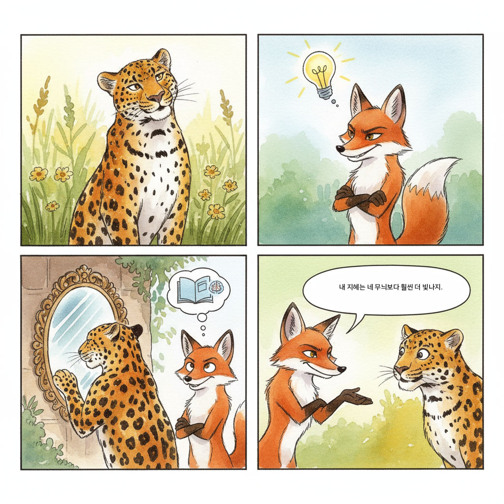 “네 털가죽은 멋질지 몰라도, 내 지혜는 네 무늬보다 훨씬 더 빛나지.”
