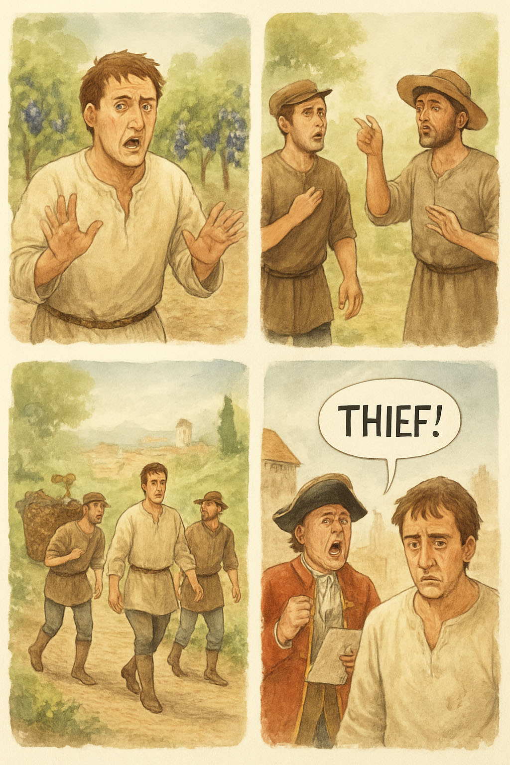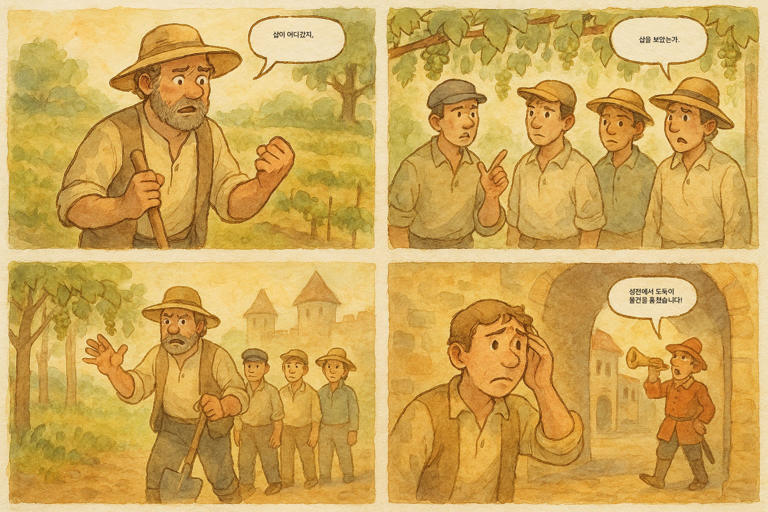 그는 혹시 일꾼들 중 누가 훔쳐갔을까 생각하며 그들을 하나하나 불러 캐물었다.