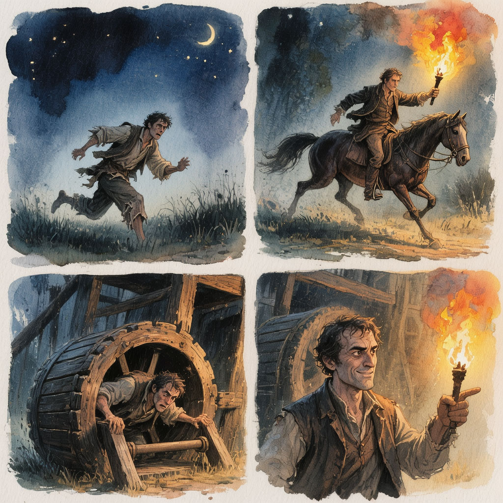 주인은 그가 사라진 것을 곧 알아차리고, 말을 타고 추격에 나섰습니다.