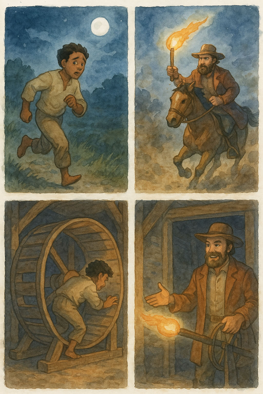 노예는 붙잡히지 않기 위해 근처의 맷돌 돌리는 맷방(트레드밀) 속으로 숨었습니다.